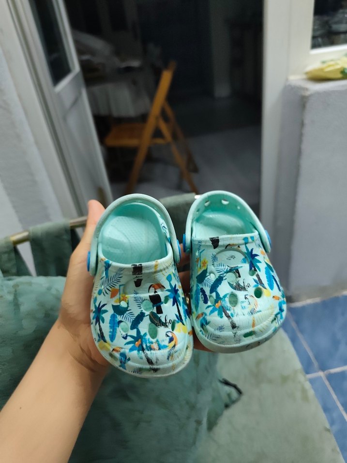 Renkli bağcıklı kaymaz tabanlı erkek çocuk terliği, batik desenli ve turkuaz renkte, rahat sokak stili için uygun. 20-21 no