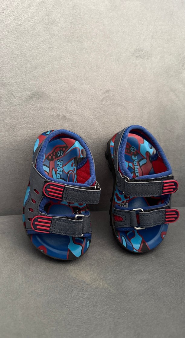 Renkli bağcıklı kayışlara ve batik desenine sahip, kauçuk malzemeden yapılmış erkek çocuk terliği.