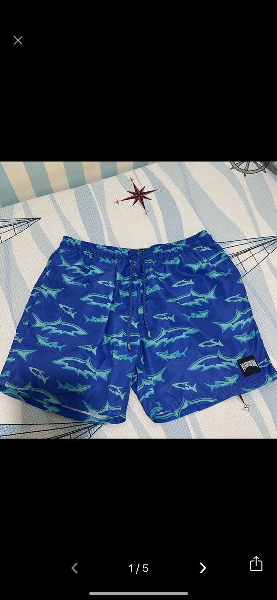 Renkli mavi bağcıklı ve köpekbalığı desenli, dar kesim mini erkek deniz şortu. Sahil ve sokak giyimi için uygun.