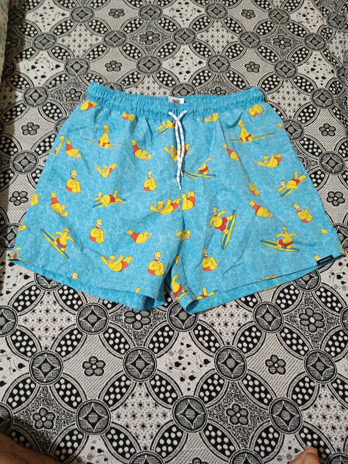 Renkli, bol kesim erkek mayo şortu, bağcıklı ve düğmeli detaylı, mavi batik desenli ve eğlenceli baskılıdır. Plaj ve sokak stiline uygundur.