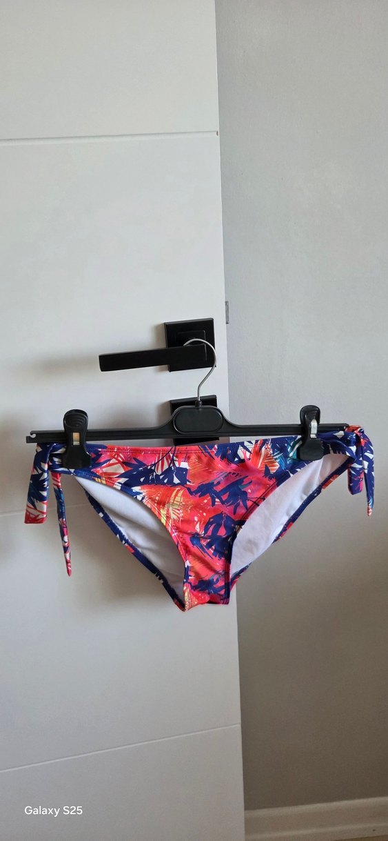 Renkli batik desenli, yan bağcıklı, kısa ve vücuda oturan kadın bikini altı. Plaj için uygun.