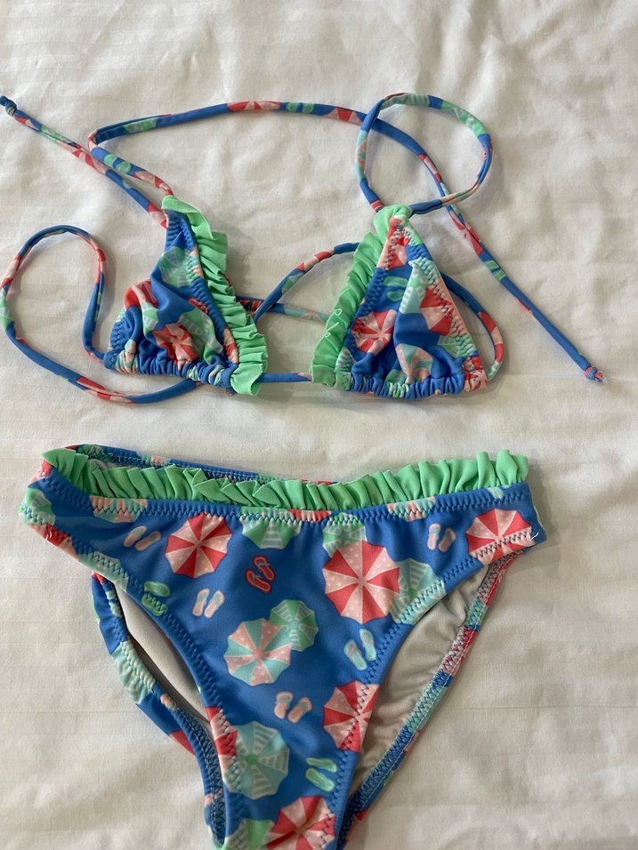 Renkli bağcıklı üst ve canlı desenli, plaj temalı baskılarla kız çocuk bikini. Eğlenceli counterculture tarzı ve plaj için uygundur. ️ 4 no yazıyor. 3-4 yasa kadr rahat kullanılır