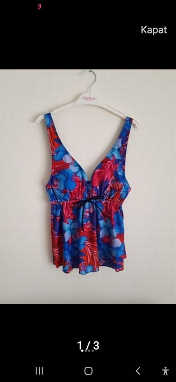 Renkli tie-dye desenli, kolsuz ve drapeli, bol kesim mini mayo. Derin V yaka ve bel bağcığı bulunur, plaj için uygundur. ️
