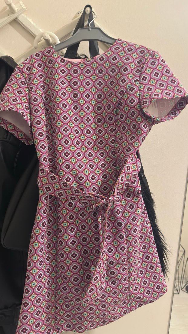 Renkli batik desenli, kısa kollu ve bisiklet yakalı, kemerli sırtı açık elbise . Günlük kullanım için rahat kesimle tasarlanmıştır.
