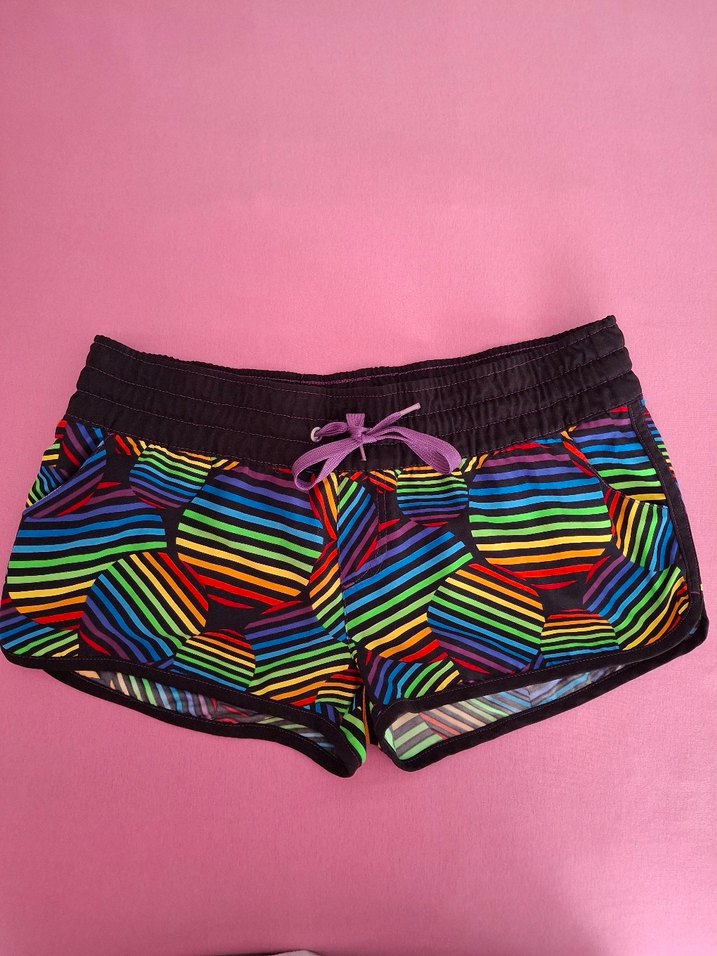Renkli tie-dye desenli, bağcıklı ve elastik bel bantlı, sentetik kumaştan yapılmış, sportif tarzda kadın mini şort. ♀️ M-L beden uyumludur. 3 kere giyildi.