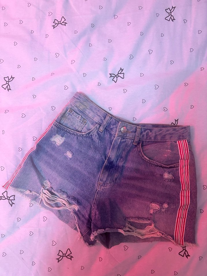 Renkli batik desenli, bağcıklı yan şeritli, bol kesim mini kadın kot şort. Günlük sokak stili için yıpranmış görünüm içerir. Önünde ufak bir sarı leke var