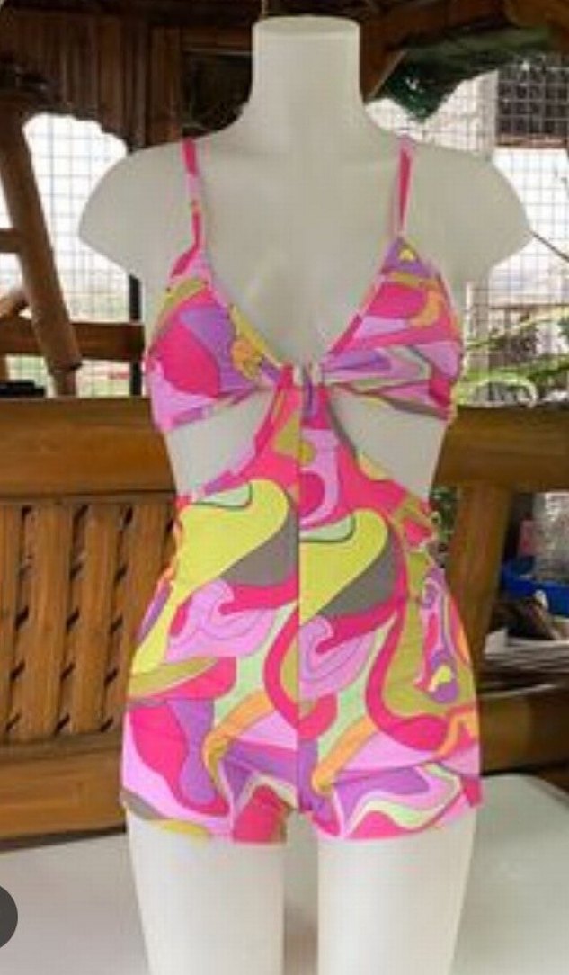 Bu dar kesim mini mayo, pastel tonlarda tie-dye desen, ince askılar ve drapeli detaylarla parti için uygundur.
