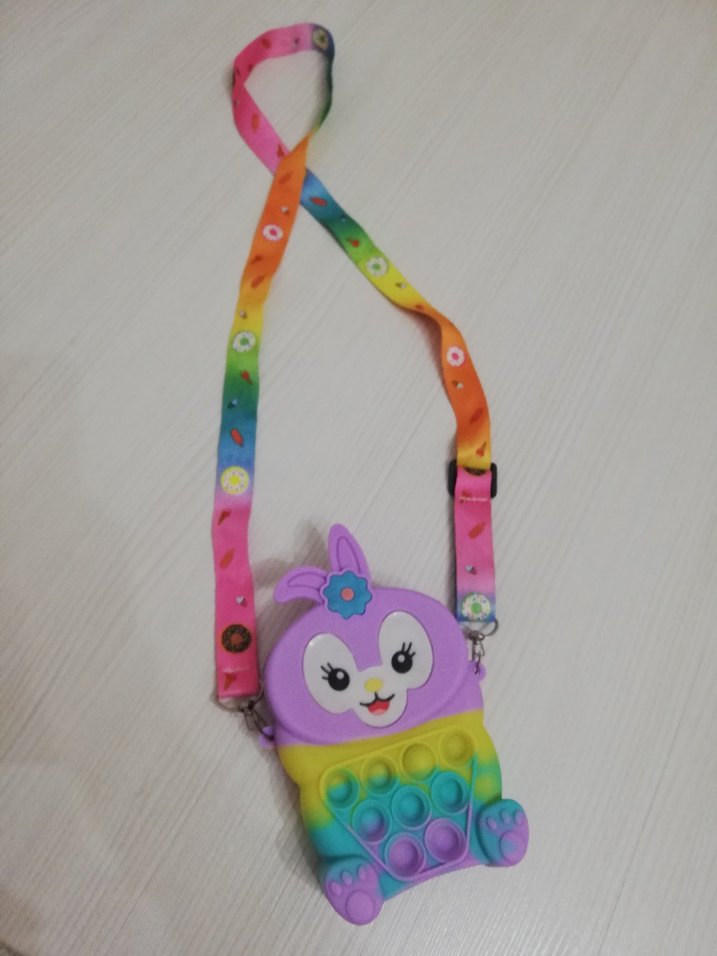 Renkli bağcıklı askısı ve pop kültür tavşan desenli kız çantası. Bohem, hippie ve retro tarzlar için uygundur.