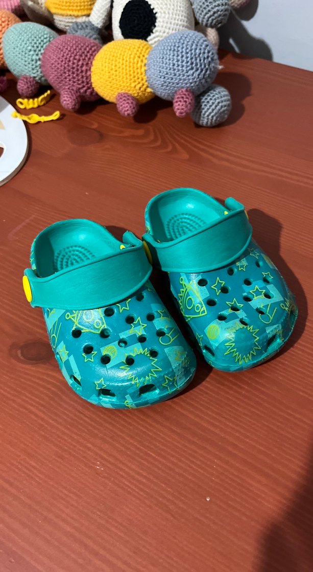 Turkuaz renkte kauçuk çocuk terliği, renkli batik desenlerle bohem, hippie ve retro tarzını yansıtıyor. Birkaç defa giyildi