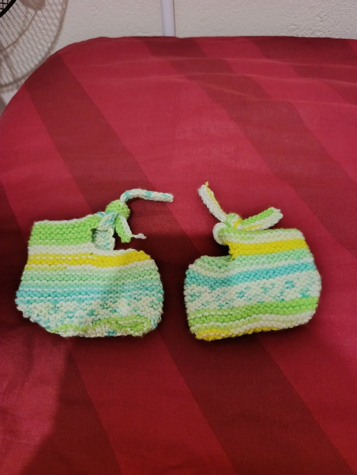 Renkli örgü malzemeden yapılmış, bağcıklı bebek botları, bohem tarzda ve batik desenlidir.