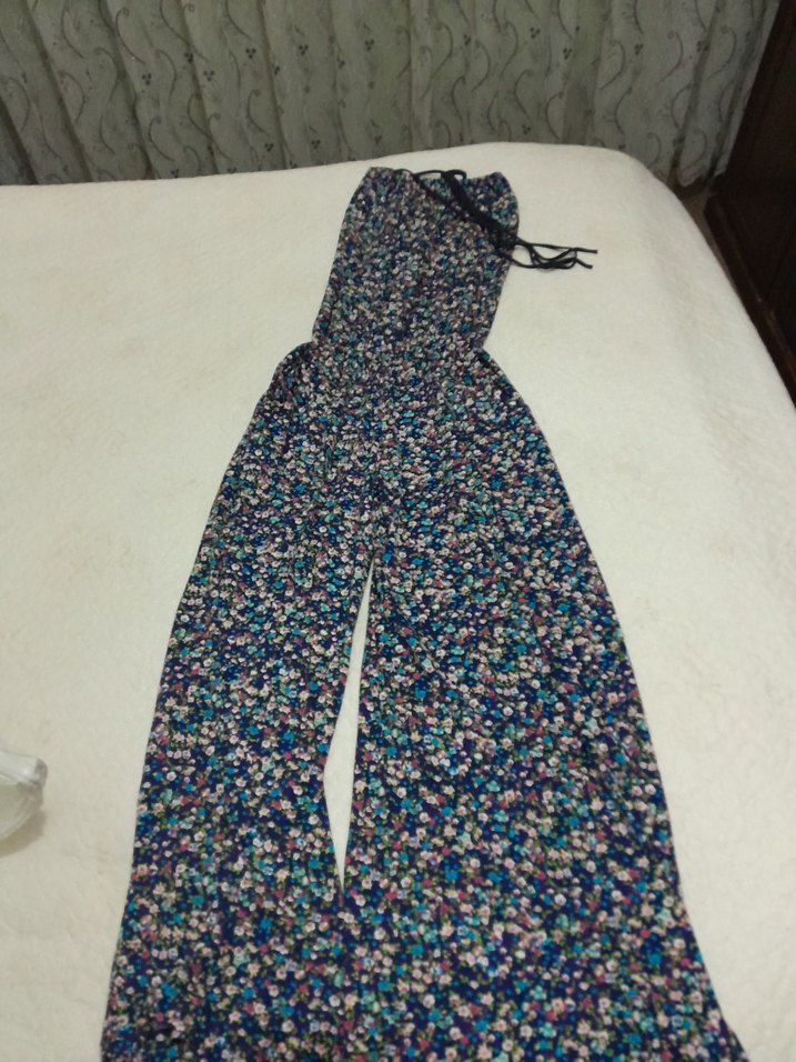 Renkli bağcıklı, askısız uzun kadın tulum. Sentetik kumaştan, bol kesim ve bohem tarzda, günlük kullanıma uygun.