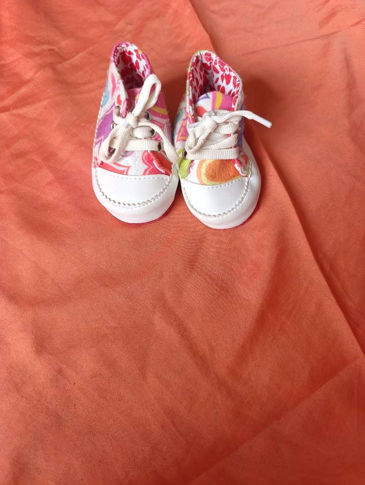 Renkli bağcıklı ve cırt cırtlı, lastik tabanlı kız bebek ayakkabısı, bohem ve retro tarzda.