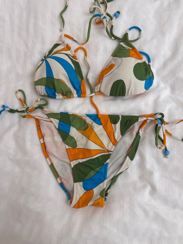 Renkli bağcıklı bikini, bohem tarzda bağcıklı ve vücuda oturan drapeli tasarıma sahiptir. pierre cardin marka boncuklu tam y2k tarzı bir bikinidr 36-38 uyumludur