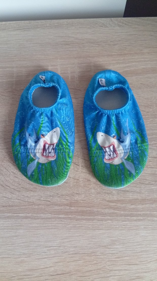 Yumuşak ve sıcak kürkten yapılmış, renkli bağcıksız erkek çocuk ev ayakkabısı. Canlı batik desenli ve köpekbalığı figürlü, kolay giyilen cırt cırtlı.