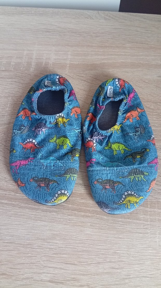 Yumuşak polar kumaştan, renkli bağcıksız dinozor desenli, cırt cırtlı erkek çocuk panduf. Bohem ve retro tarz etkisiyle.