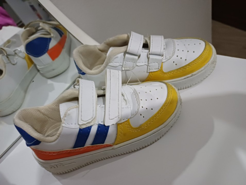 Bağcıksız, cırt cırtlı ve renkli desenli erkek spor ayakkabısı. Kauçuk taban dayanıklılık sağlar.