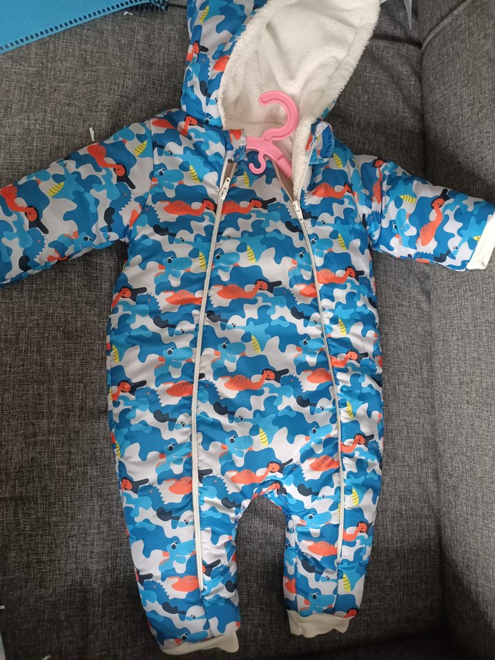Renkli bağlama desenli, kürklü kapüşonlu, yumuşak ve sıcak kumaştan yapılmış bebek kayak tulumu.