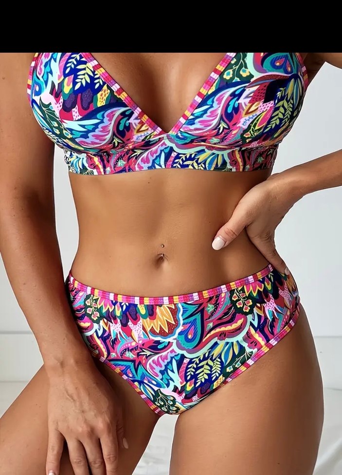 Renkli bağlama desenli, dantelli ve askılı tasarıma sahip, bohem tarzda mini boy bikini. Plajda kullanıma uygundur.