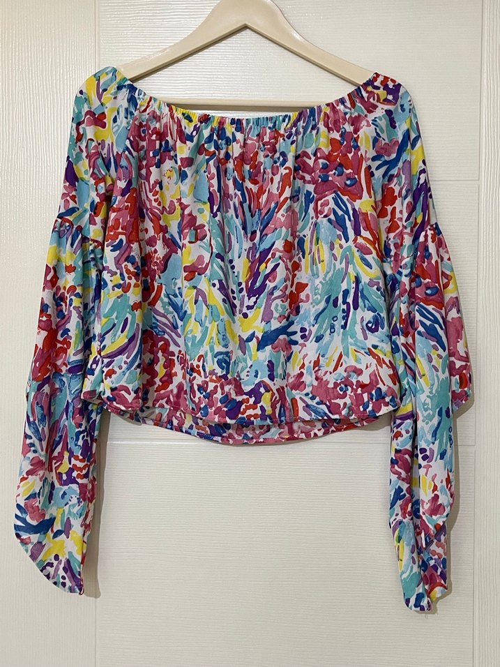 Renkli bağlama desenli, kayık yaka ve uzun drapeli kollara sahip bohem tarzda kısa ve bol kesim kadın bluz. S-M