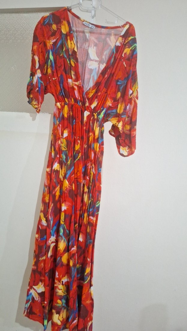 Renkli bağlama desenli, bol kesim, V yaka ve ince askılı bohem uzun elbise. Drapeli sentetik kumaştan, günlük kullanım için uygun.