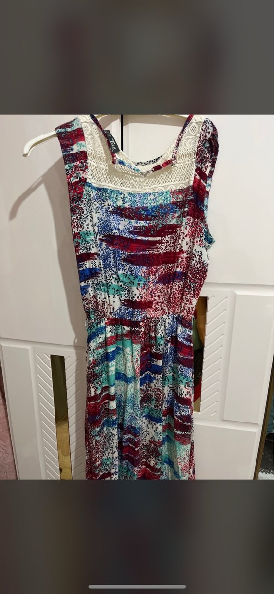Renkli bağlama desenli uzun elbise, V yaka ve dantel detaylı, bol kesim ve yumuşak sentetik kumaştan bohem tarzda. Takas