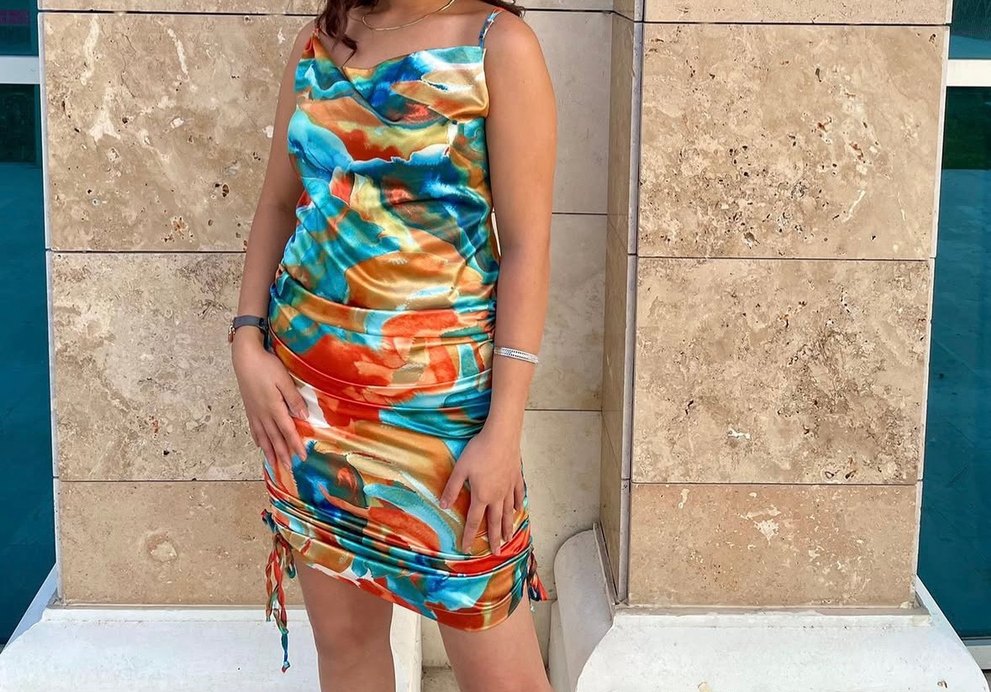 Renkli bağlama desenli, askısız ve drapeli kesime sahip, sentetik kumaştan yapılmış, vücuda oturan mini elbise. Parti için uygun, bohem tarzda.