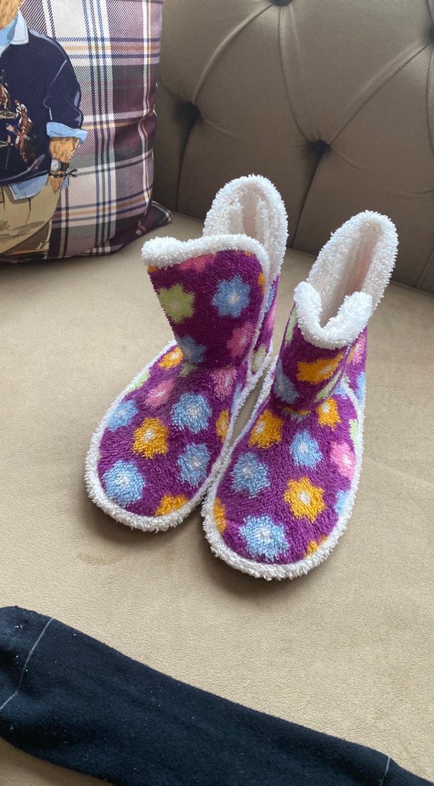 Renkli bağlama desenli, yumuşak ve sıcak kürklü ev botu. Konforlu ve rahat iç mekân kullanımı için uygundur.