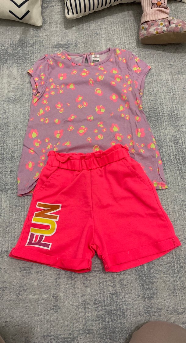 Renkli bağlama desenli kısa kollu üst ve "FUN" yazılı pembe şortlardan oluşan bebek kız takımı. Şortlar elastik bel ve cırt cırtlı kapanışa sahiptir.