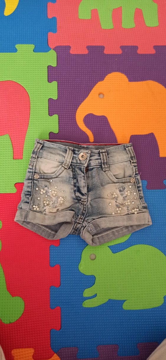 Düğmeli ve süs taşlı, renkli bağlama desenli, fitted kesim kız kot şort. Trend sokak stili için uygun. YENİ AYARINDA TEMİZ ÜRÜNDÜR 3 YAŞ YAZIYOR AMA 2-2,5 YAŞA UYUMLUDUR