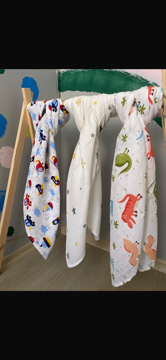 Yumuşak sentetik kumaştan yapılmış, araçlar ve dinozorlar gibi eğlenceli desenlere sahip renkli bağlama desenli müslin çocuk battaniyesi.