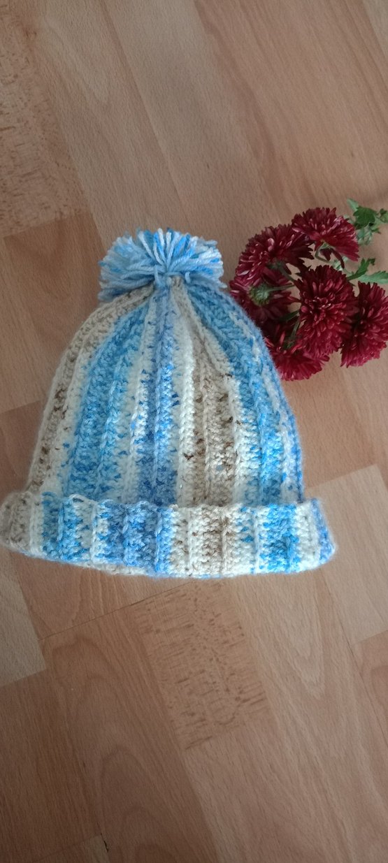Mavi ve krem tonlarında bağlama desenli, ponponlu renkli örgü çocuk beresi. Bohem tarzda, yumuşak dokulu bir model.