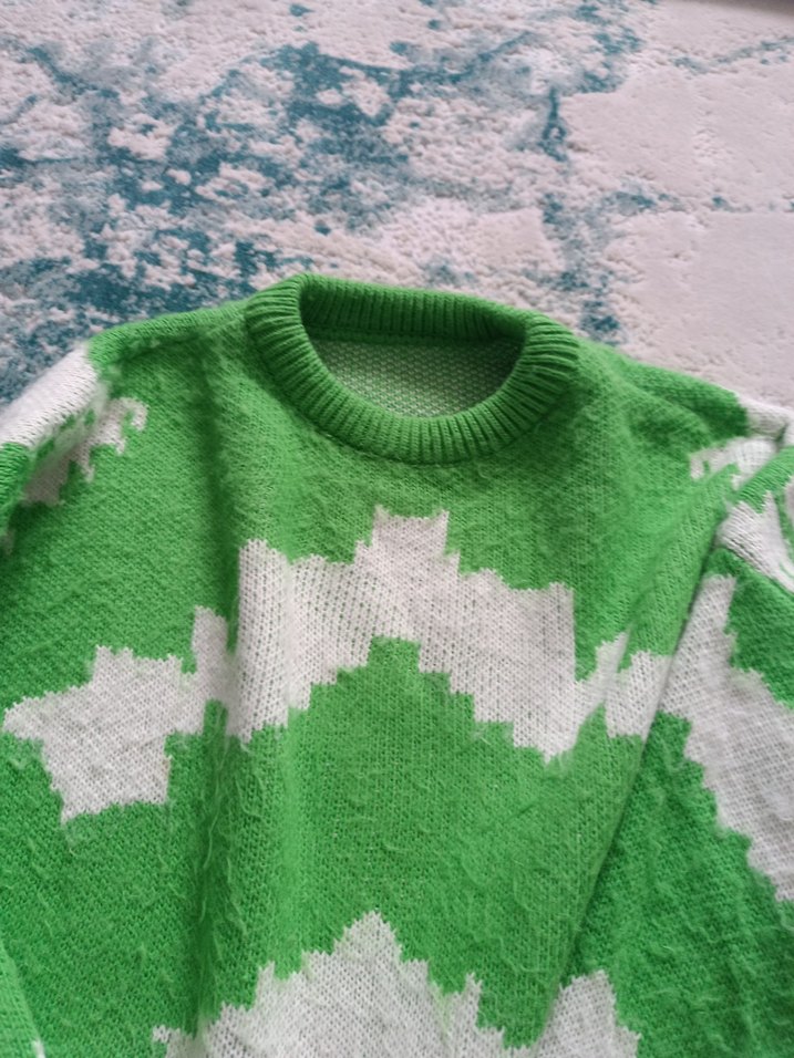 Yeşil ve beyaz bağlama desenli örgü kazak, yuvarlak yaka ve uzun kollu. Bol kesim ve rahat dokusu ile bohem tarzına uygun.