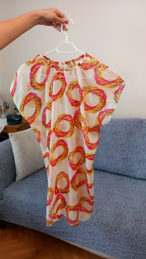 Bu hamile bluzu, bol kesim, kısa kollu ve drapeli tasarıma sahiptir. Yuvarlak yakalı ve midi boyda, yumuşak sentetik kumaştan yapılmış pastel bağlama desenlidir.