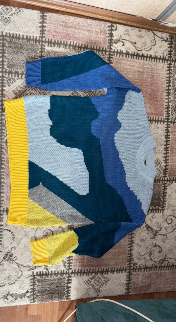 Bağlama desenli, uzun kollu, yuvarlak yaka ve bol kesim kadın triko kazak. Mavi, gri ve sarı tonlarıyla modern bir tarz sunar.