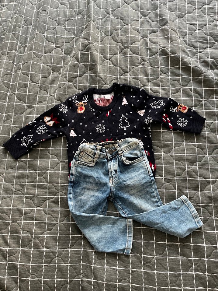 Renkli bağlama desenli, triko uzun kollu tişört ve gri denim pantolon içeren erkek bebek takımı, sokak stili ve rahatlığı bir arada sunar. İkiside 86 cm çok az giyildi #yılbaşıkazağı #çocukkazak