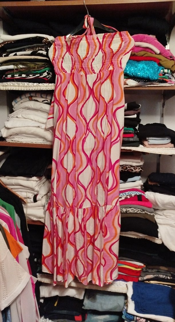 Renkli bağlama desenli, askısız uzun elbise. Yumuşak sentetik kumaştan, pilili detaylara sahip ve vücuda oturan kesimle günlük kullanım için uygun.