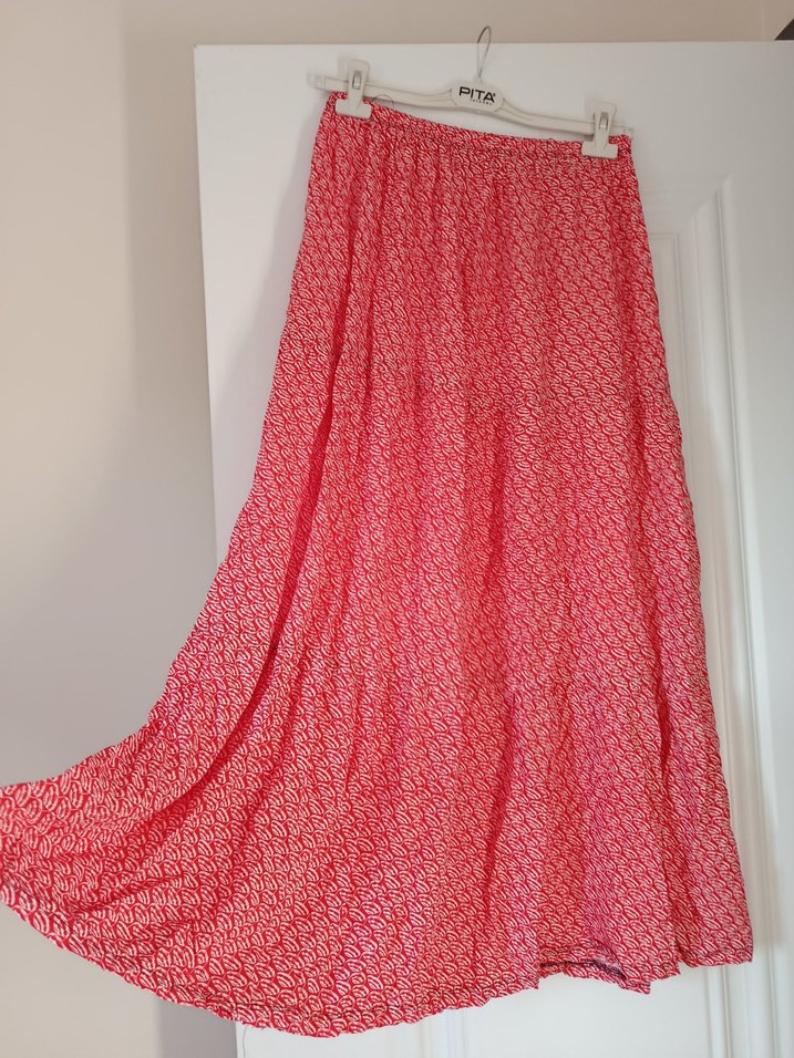 Rahat kesimli, pamuk kumaştan yapılmış, renkli bağlama desenli uzun bohem etek, günlük kullanım için uygundur.