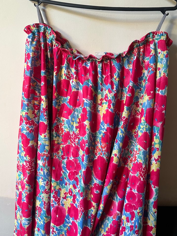Renkli bağlama desenli, bol kesim ve drapeli uzun hamile eteği, bohem tarzını yansıtır.