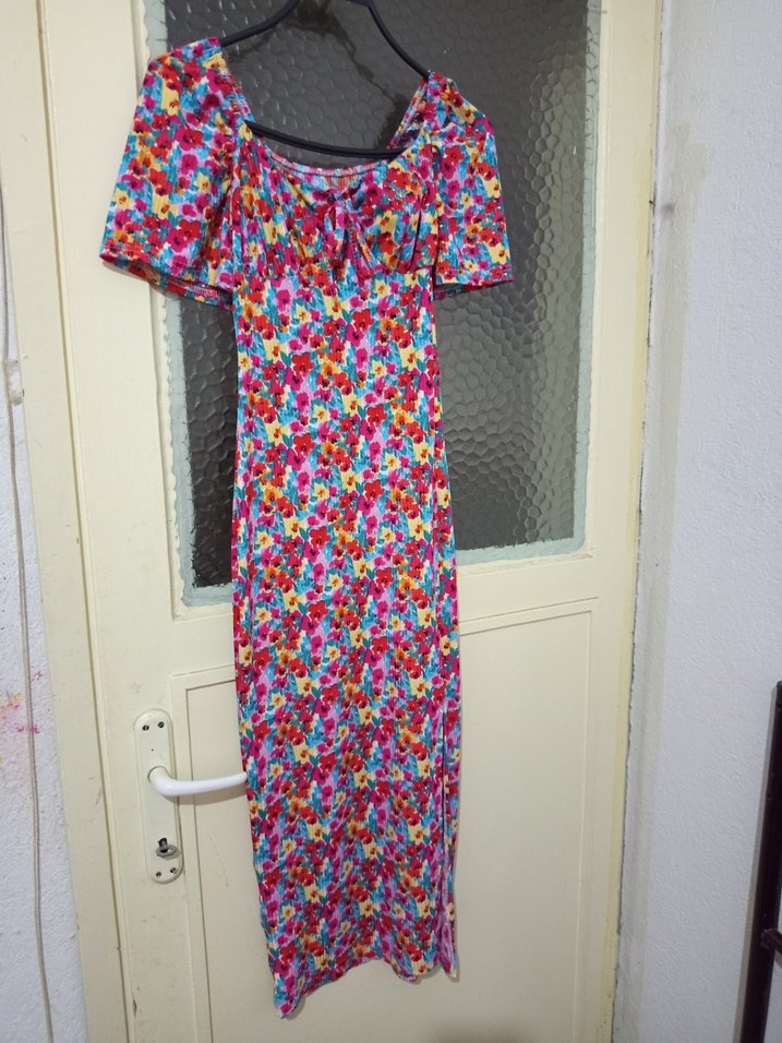 Renkli bağlama desenli, kısa kollu ve tekne yaka uzun elbise. Drapeli tasarımıyla bohem tarzını yansıtır. S m bedene uygundur