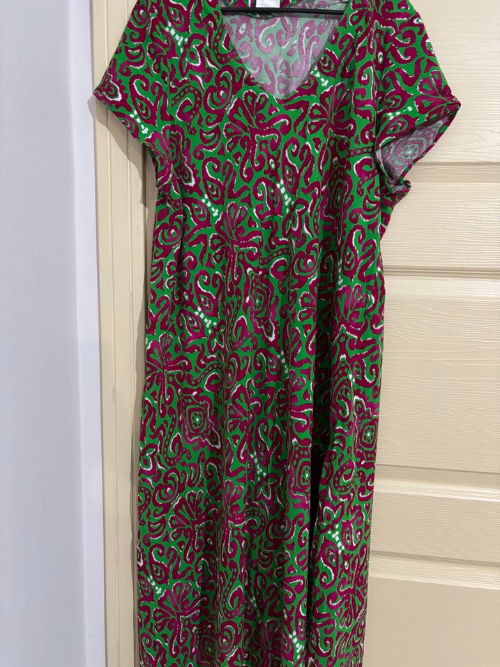 Renkli bağlama desenli uzun hamile tunik, bol kesim ve drapeli tasarıma sahiptir. V yaka ve kısa kolludur, sentetik kumaştan bohem tarzını yansıtır.