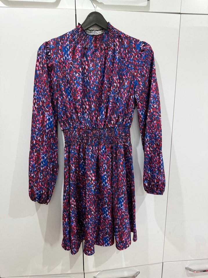 Renkli bağlama desenli, uzun kollu, yüksek yakalı ve pileli detaylara sahip, vücuda oturan mini elbise. Sentetik kumaştan, romantik anlar için ideal bohem tarz.