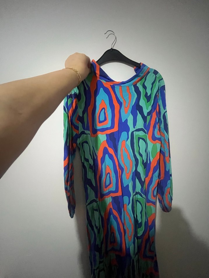 Renkli bağlama desenli, uzun kollu ve yuvarlak yakalı bol kesim uzun elbisedir. Drapeli tasarımı ve canlı renkleriyle dikkat çeker.