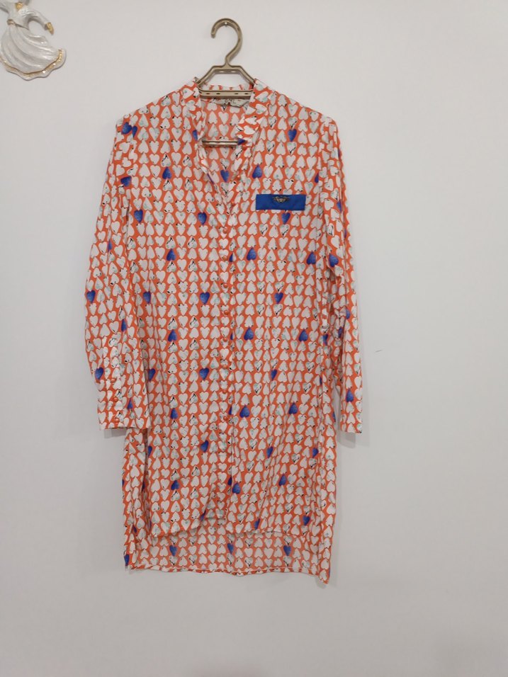 Pamuk kumaştan, yakalı ve düğmeli, uzun kollu, bol kesim, renkli bağlama desenli kadın tunik. Rahat ve günlük kullanıma uygun.ürün temiz kullanılmıştır herhangi bir defarmasyonu yoktur iki koltuk altı arası 52cm onu kısa arkası uzun modeldir ön 87 arkası 100 cm uzunluğundadır krep kumaş çok rahat edeceğiniz bir tunik