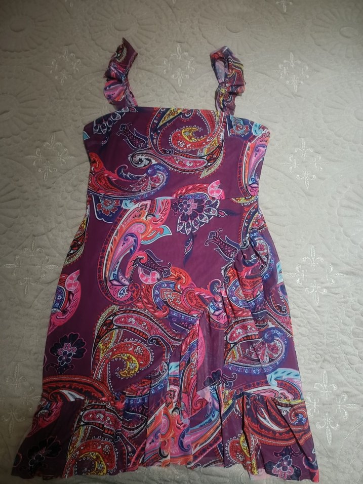 Renkli bağlamalı askılara ve drapeli tasarıma sahip, yumuşak sentetik kumaştan yapılmış, canlı batik desenli, vücuda oturan elbise. Parti için uygun.