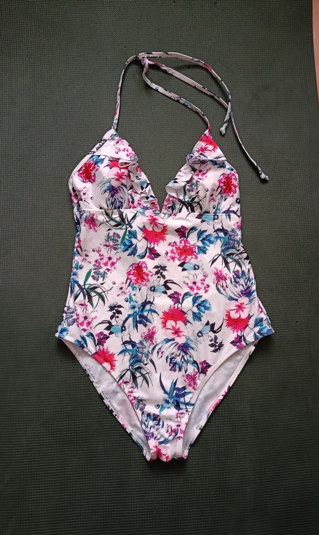 Renkli çiçek desenli, bağlamalı askılı, dantel detaylı, bohem tarzda, vücuda oturan kadın mayo.