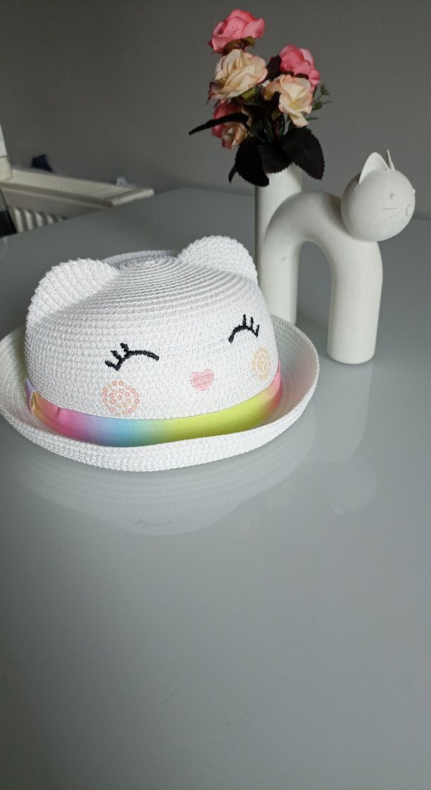 Bu beyaz örme çocuk şapkası, kapalı gözler ve pembe yanaklarla sevimli bir ayı yüzüne sahip olup, renkli bağlamalı bir bant ile tamamlanmıştır. Bohem ve retro stili yumuşak örme dokuyla sunar. Çok az kullanıldı. Bedende 6 10 yaş kategorisi çıkmadı mecburen 8 yaşı işaretlemek zorunda kaldım