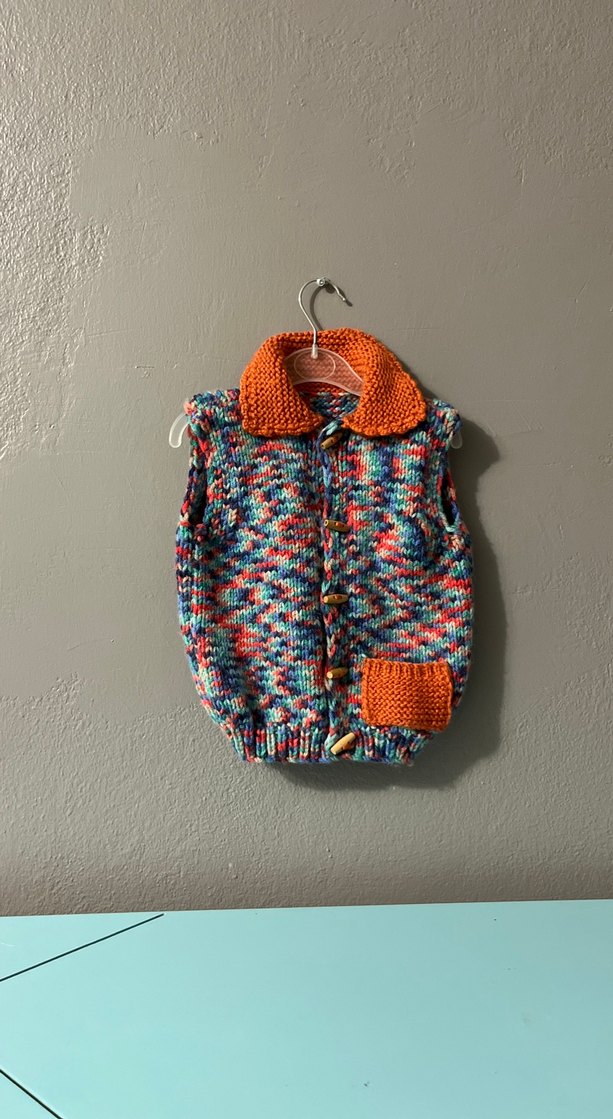 Kızlar için renkli bağlamalı desenli, yakalı ve bol kesim örgü yelek. Canlı turuncu yakası ve cep detayı bulunur. El emeğidir