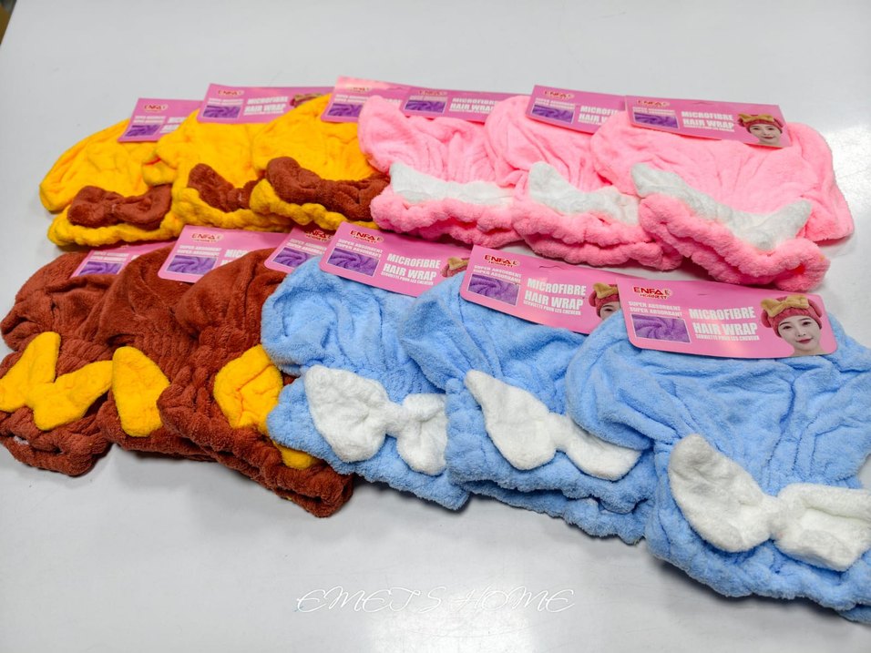 Yumuşak ve emici kumaştan, saçları güvenle tutan renkli bağlamalı desenli saç kurutma bandı.