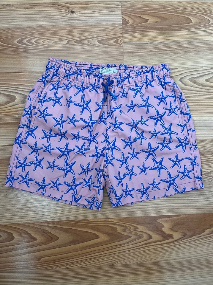 Renkli pembe zemin üzerine mavi denizyıldızı desenli erkek mini deniz şortu. Elastik bel ve bol kesimiyle plajda rahat kullanım sağlar.