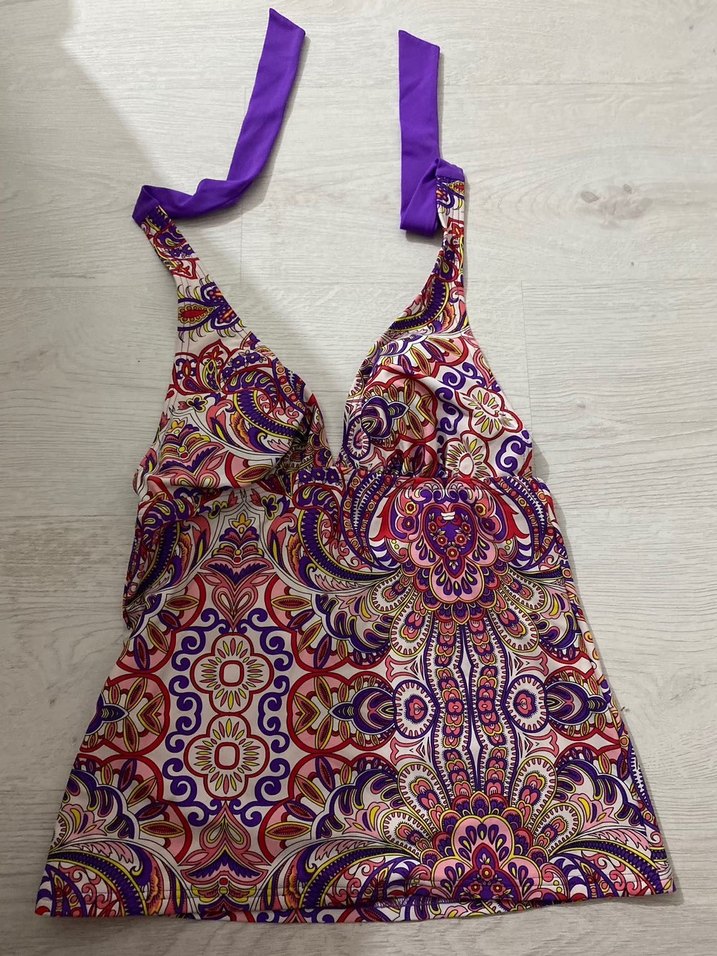 Renkli tie-dye desenli, dantel detaylı ve mor ip bağlamalı, bohem tarzda, vücuda oturan mayo üstü. Midi boy ve günlük kullanıma uygun.